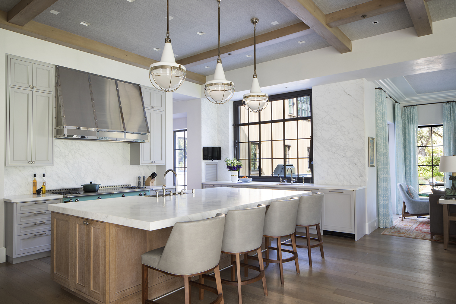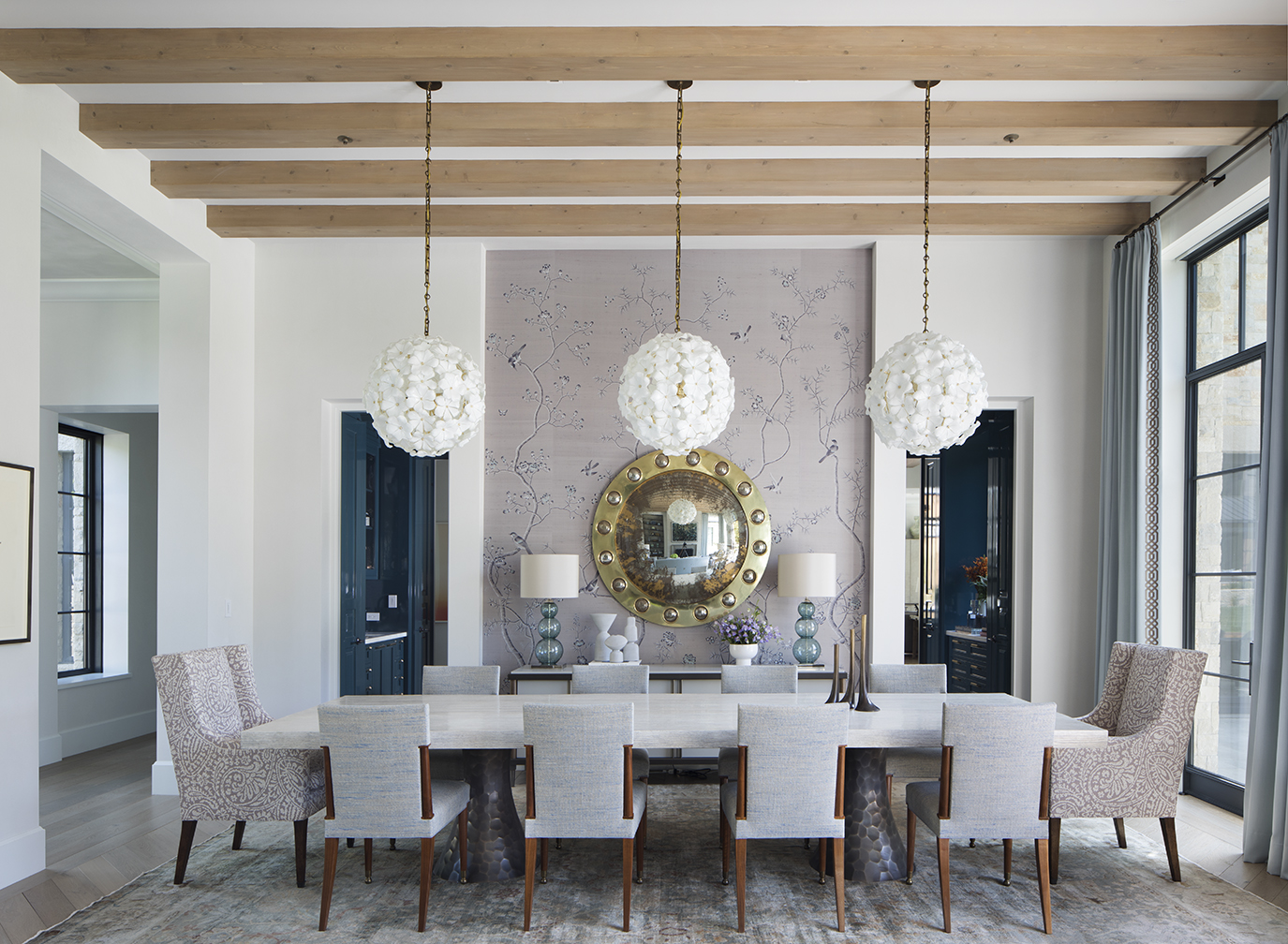 The breakfast room chairs by Rose Tarlow Melrose House from Shears & Window are upholstered in a fabric by Sloane Miyasato, the rock crystal pendant light is by Venfield, and the white-oak table is from Therien Studio Workshop.