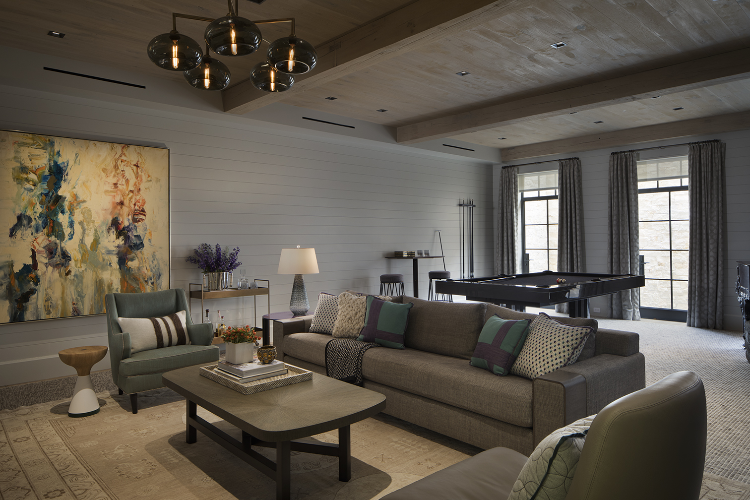 In the games room, the sofa is by Joseph Jeup, the club chair is by Studio Van den Akker, and the cocktail table is by Skram; the custom rug is by Mark Nelson Designs, and the pool table is by Blatt Billiards.