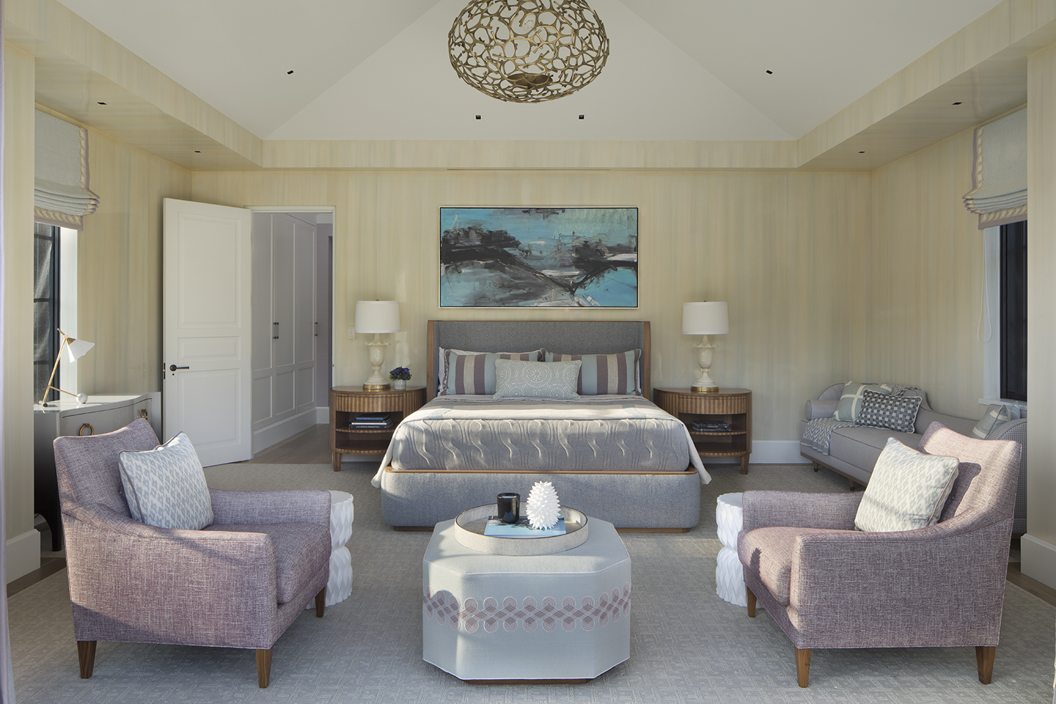 In the master bedroom, the hand-painted lacquer walls are by Willem Racke Studio, and the settee and bed are custom designs. Patrick Naggar club chairs from Ralph Pucci are covered in a Manuel Canovas fabric from Cowtan & Tout, the ottoman is custom, and the bronze pendant light is by Hervé Van der Straeten.