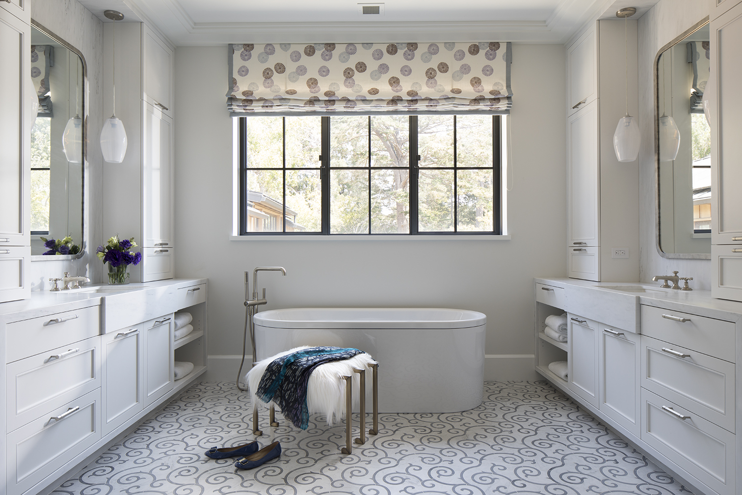 White-glass pendants by John Pomp Studios flank the tub in the master bath. The bronze ottoman with a Mongolian lamb seat is by Kimberly Denman, and the marble floor tiles are by Waterworks.