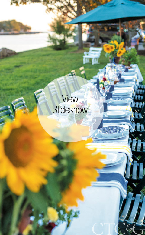 When it came to planning a celebration for friends and family who collaborated on the restaurant’s creation, the setting was a top consideration, and Farkas chose her mother’s estate on Flying Point in Stony Creek. She wanted the event to be elegant without being fussy and took advantage of breathtaking views by setting up the dinner’s courses on several areas of the property. Cocktails and hors d’oeuvres were located at a bar on the point, first-course salads and a main-course buffet were served on the main lawn, and dessert was enjoyed on the front terrace. When it comes to entertaining, Farkas says: “Let the setting be your guide. Create around the available space, and let your guests move around. You don’t have to be stuck at one table.”