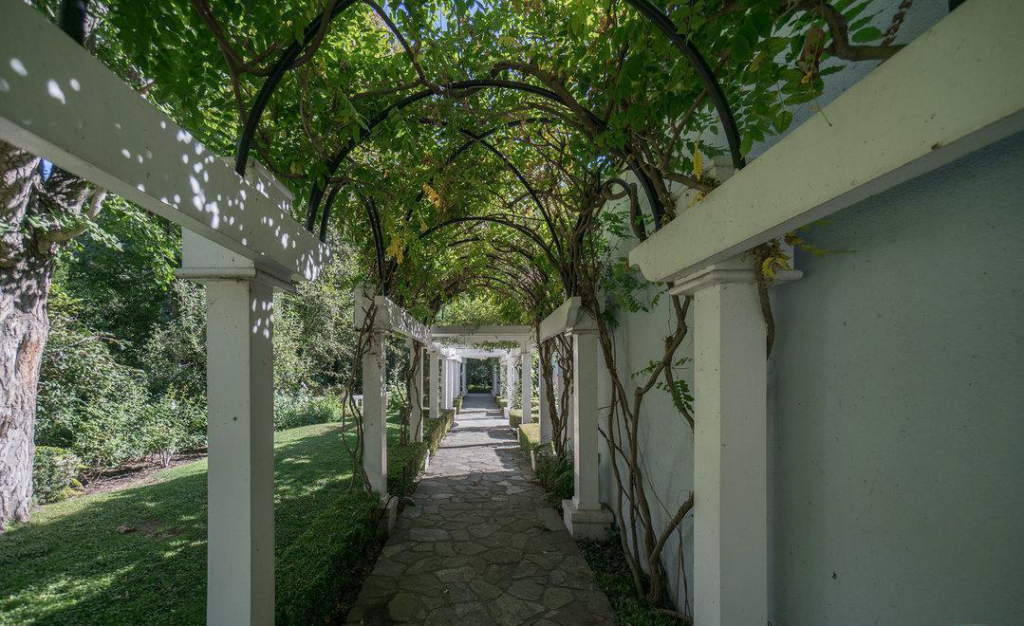 Built in 1935 but updated since, the Bel-Air spread is romantic and traditional. Vines hang over a colonnade that connects the motor court and three-car garage to the home’s double door entrance.