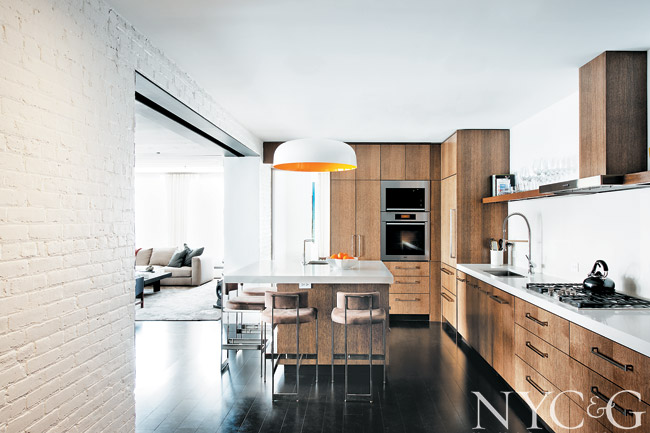 The owner of this Tribeca loft had initially told the team at DHD that he only wanted a “refinish” of the floors, but soon a gut renovation was under way, including a mandate to open up the kitchen to a large, light-filled living and dining area. The room still manages to retain its own identity, notably defined by an ample square island and “a simple, bold lighting fixture, which does a lot to warm up the modern space,” comments Liz O’Brien, “along with luxurious touches, like suede upholstery and rich wood floors.”
