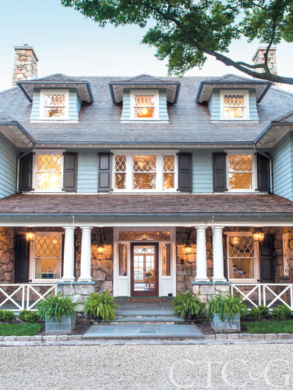 The level of detailing—from the dark shutters to the window frames to the placement of the stones on the ground floor—add even more power to this house’s traditional exterior. Windows and doors are through Dynamic Architectural Windows & Doors. Shutters are through Kingsland Shutter Company. Columns are through Cheyenne Company.