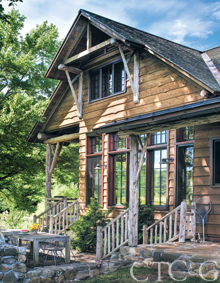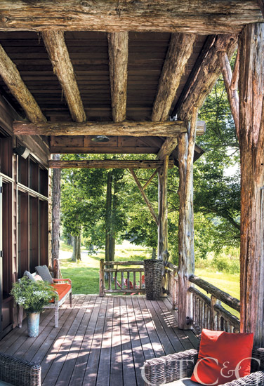 Reclaimed cedar timbers support a bucolic country-style front porch.