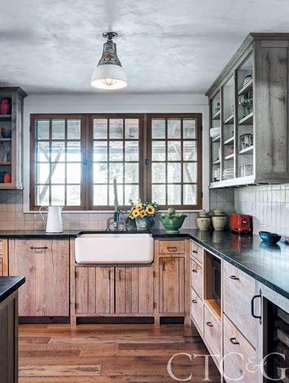 Soapstone kitchen countertops from Tedeschi Tile & Marble complement a Rohl farmhouse sink with Lefroy Brooks fittings.