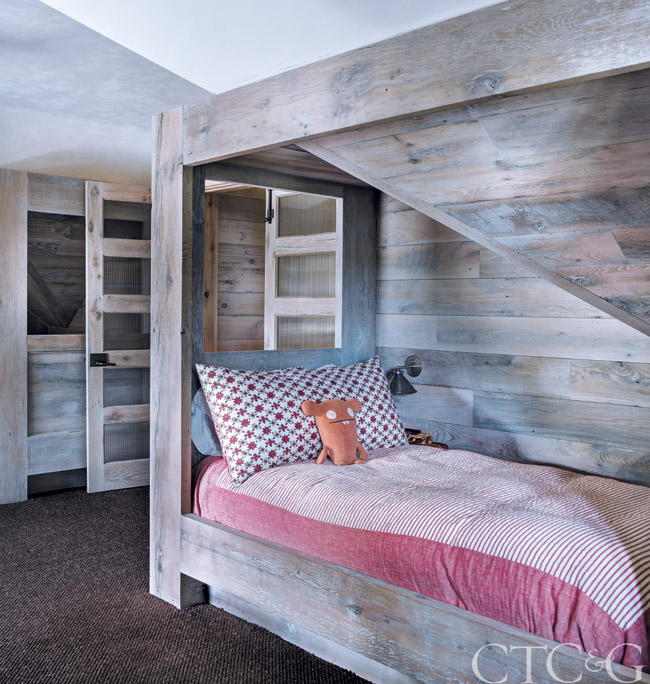 A reclaimed-wood bunk bed designed by Reese Owens unobtrusively slips into the house’s structure.