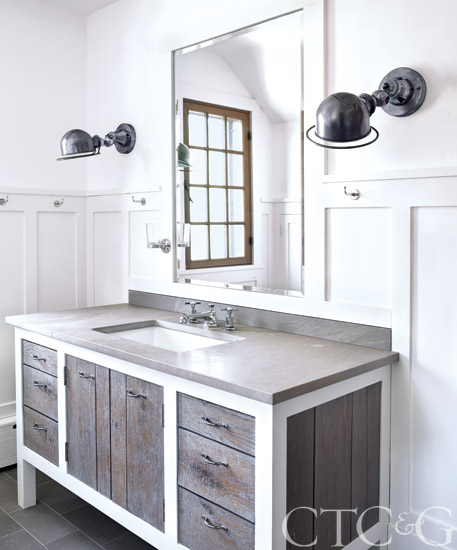 Bright white paint outlines the bathroom vanity (fabricated by Nichols Woodworking).