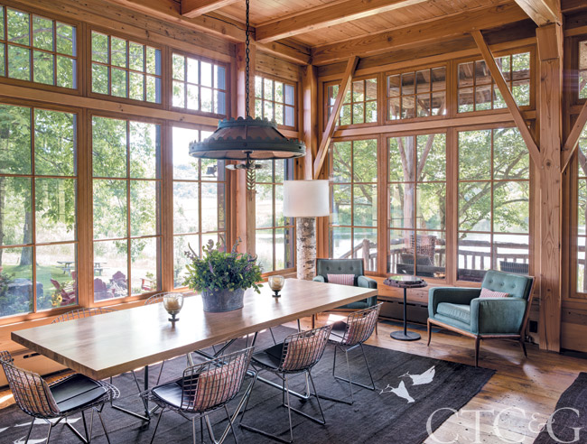 A bright and airy dining room mixes a sleek and modern table with comfortably relaxed dining room chairs and even more supple armchairs. The tall windows provide a view out into the surrounding nature while the solidity of the wooden beams offers respite and protection.