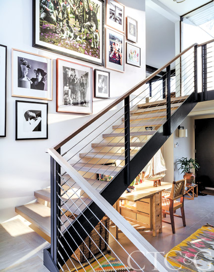 Open-plan modernism is continued through the steel and light-wood staircase.