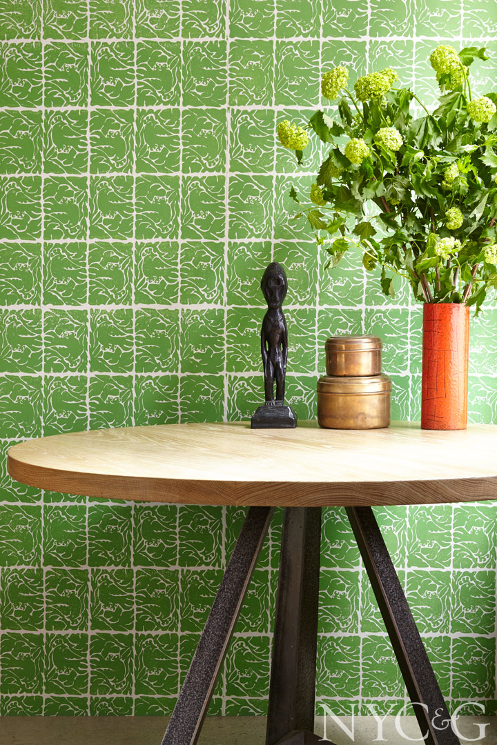 Adrienne Neff Design Services’ environmentally friendly Uzu wallpaper, named for the Japanese term for “swirl of water,” incorporates universal symbols of growth, rejuvenation, and renewal.