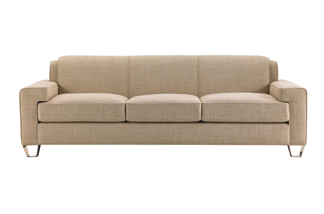 Metal legs—of nickel, brass, or rose gold—support this “blended modern” sofa by Barry Goralnick, which features a state-of-the-art electric port or outlet, positioned where the customer chooses.