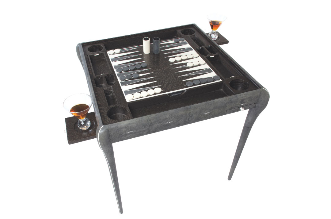 This shagreen, bone, and lacewood game table by John Lyle is equipped with shagreen-lined chips and cups as well as cast-bronze chessmen. Pull-out drink trays finish off the look.