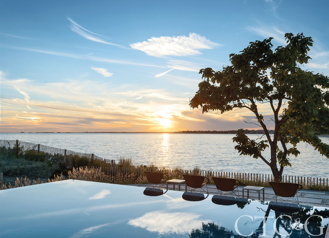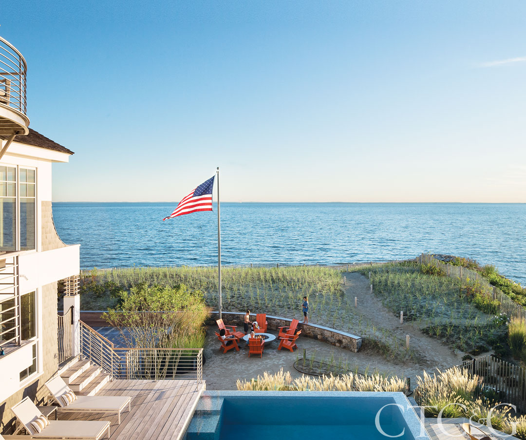 Architecture, Pagliaro Bartels Sajda Architects. Pool, Drakeley Pool Company. Masonry and plantings (throughout), Freddy’s Landscape Company. Engineer, Roberge Associates Coastal Engineers. Chairs, side table, chaise lounges, lounge chairs and coffee table, Janus et Cie. Adirondack chairs, Loll, through Design Within Reach. Fire pit, Concreteworks. Planters, DeepStream Designs. Umbrella, Tuuci.