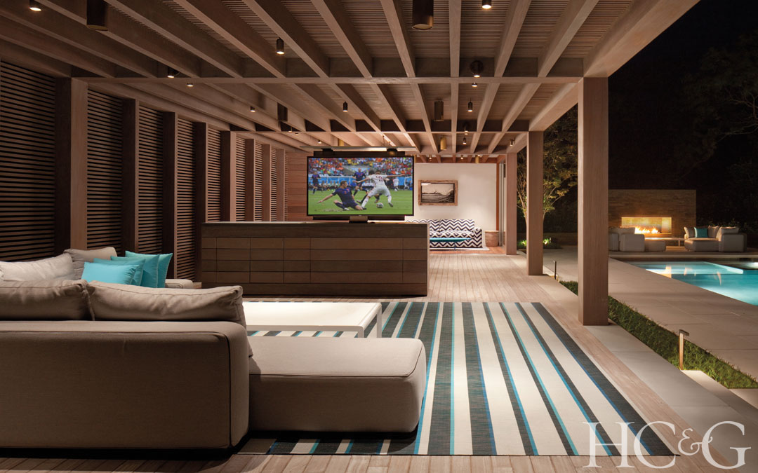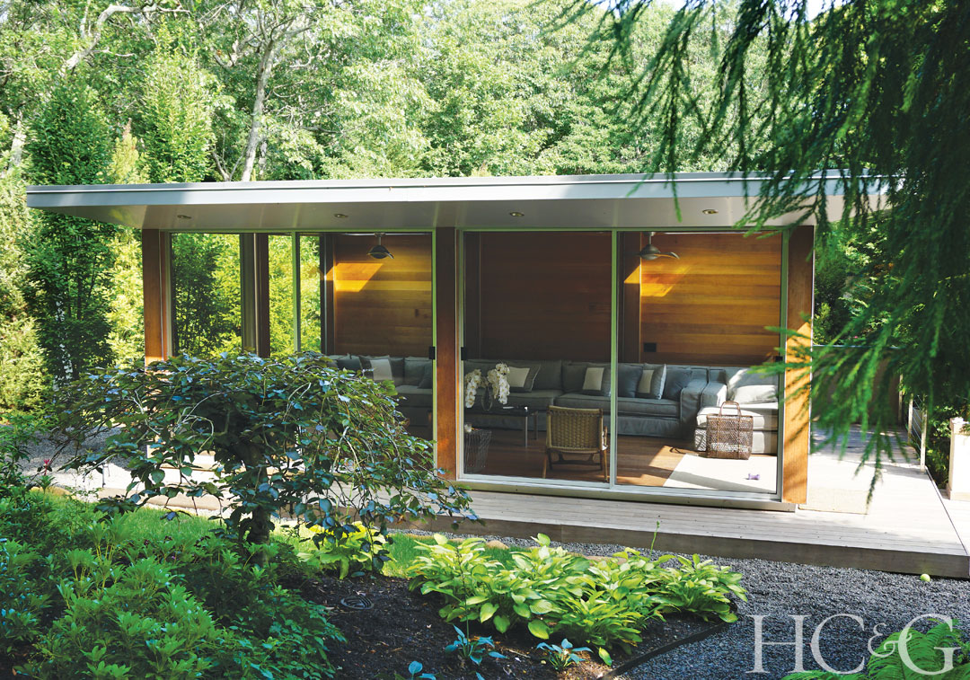 A lot of living can be done in a small space when it is “organized and very well thought out,” which is what Smyth says of this East Hampton pool pavilion. The streamlined structure, which fully embraces its narrow site and responds to the natural terrain, features many of the same materials found in the main residence, including mahogany and aluminum.