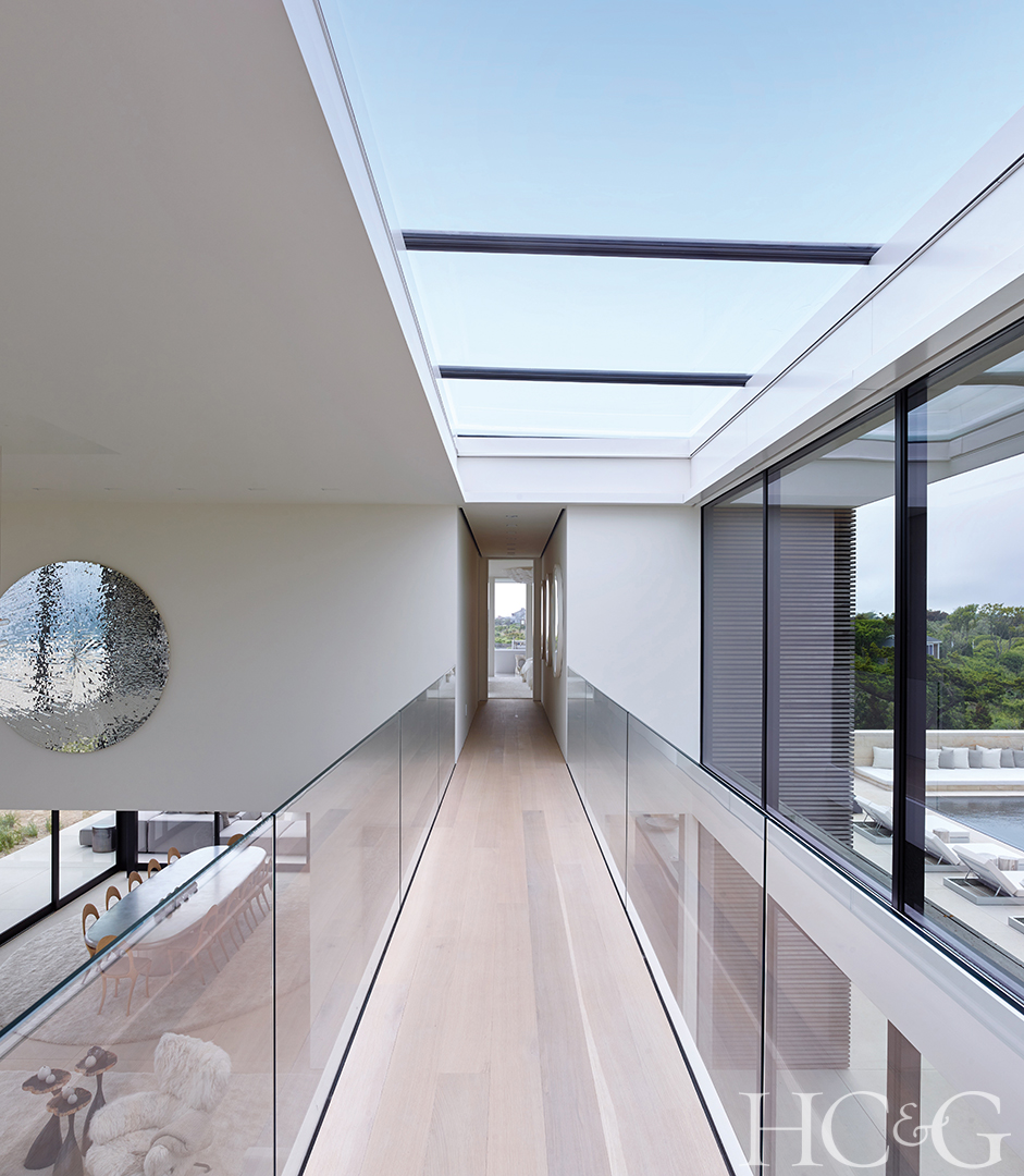 Inside, a skylit catwalk provides views of the living area below, as well as the pool and both bodies of water.