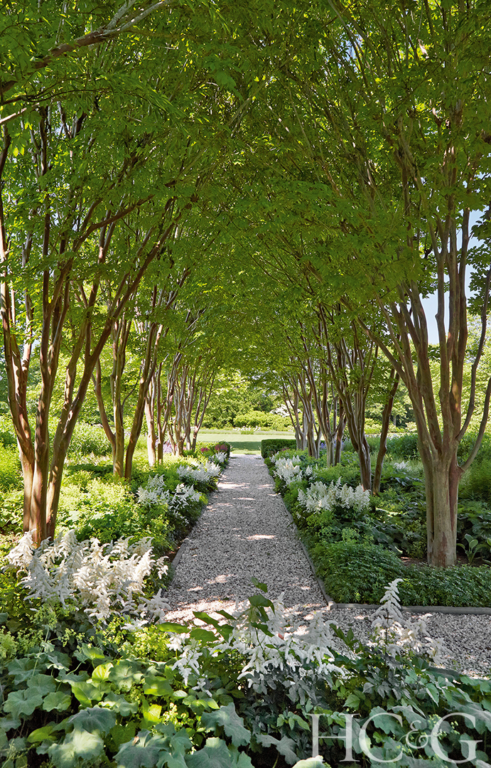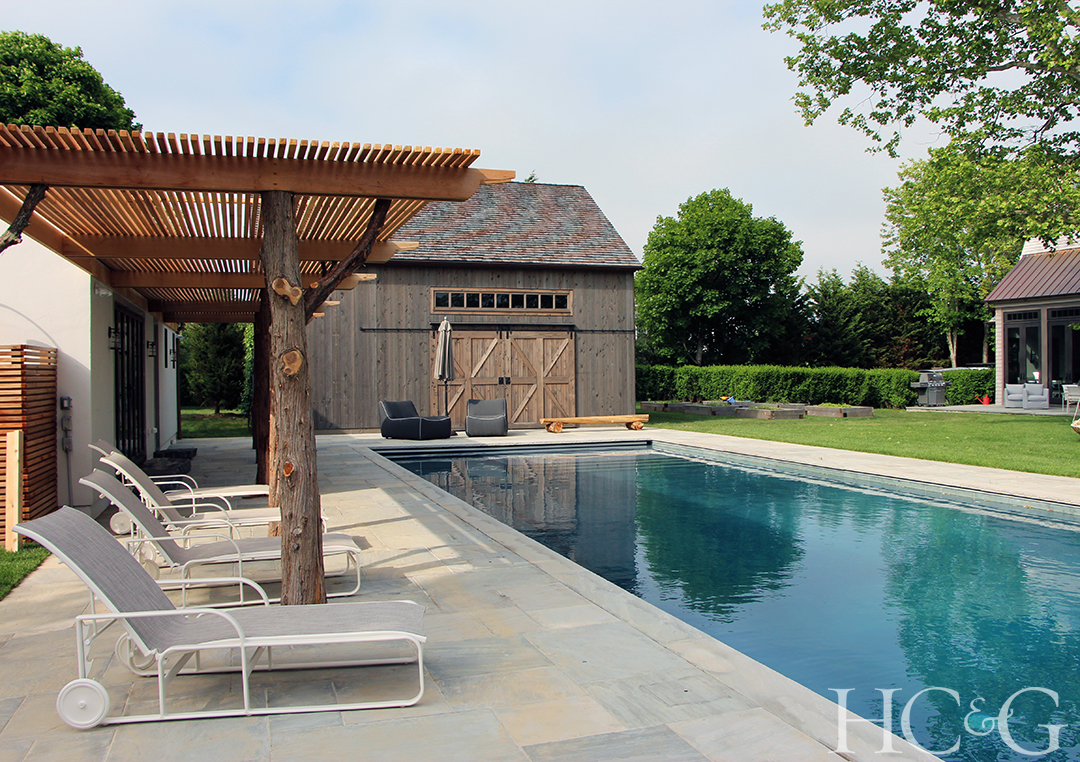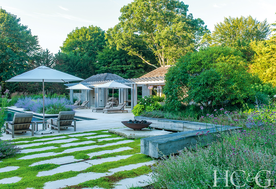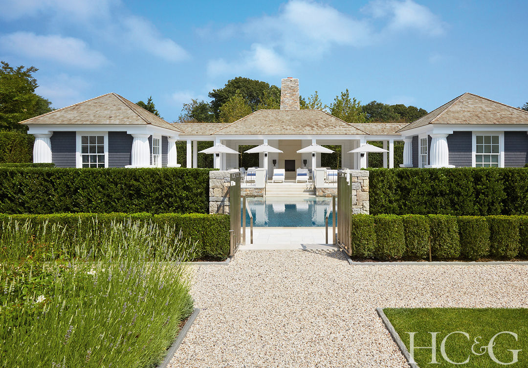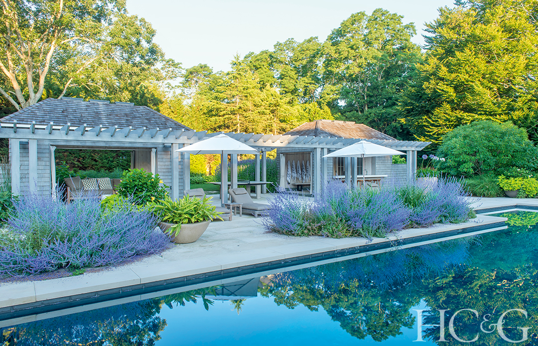The manicured grounds of this Bridgehampton home comprise a large lawn bordered by gravel paths, boxwood, lavender, perennials, and horse chestnut trees, plus a sunken garden near the pool that includes a bosk of London plane trees—an ideal shady spot for entertaining. Even the pool is meant to function as a water feature within the landscape. Judge Matthew Patrick Smyth praises how this “classic design approach avoids being predictable.”