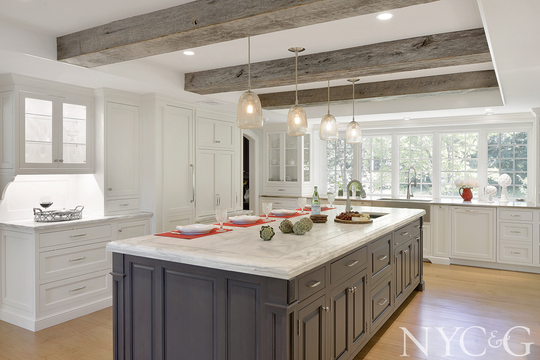 For the renovation of a Westchester kitchen, Carol Kurth’s goal was to create a space that’s at once sunny, cozy, and rustic. After opening it up to adjacent rooms, she added a large bay window, reclaimed-timber trusses, vintage pendant lights, and an oversize marble island that accommodates the entire family. As judge Matthew Patrick Smyth notes, the room incorporates “traditional elements with a modern sensibility.”