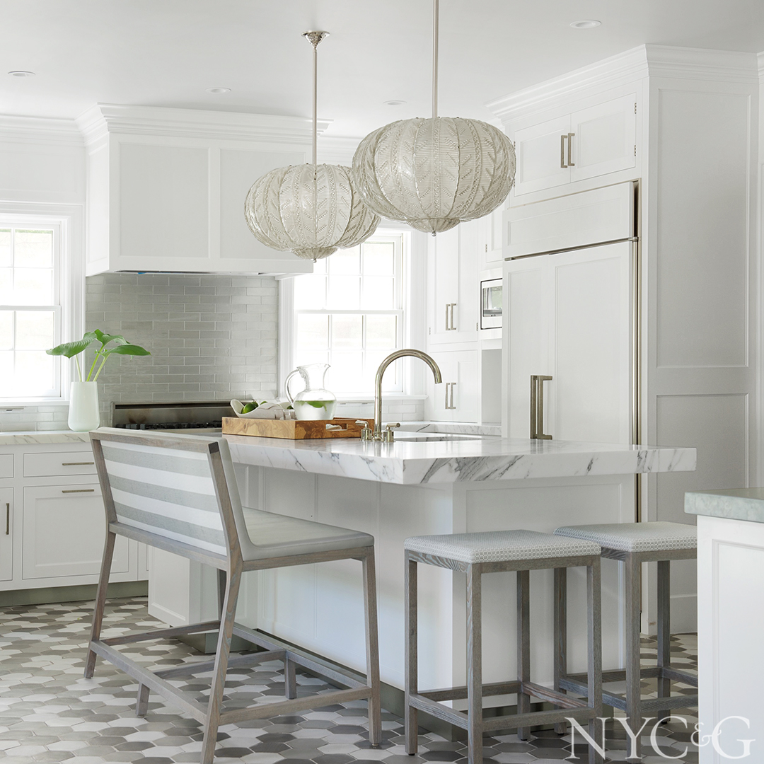 The designers of this Rye kitchen set out to create a space that’s “light and soft, with a touch of funky,” while also making it practical for a busy family of six. They removed a doorway, which opened up the space and allowed for a desk, additional cabinets, and a custom L-shaped vinyl banquette.