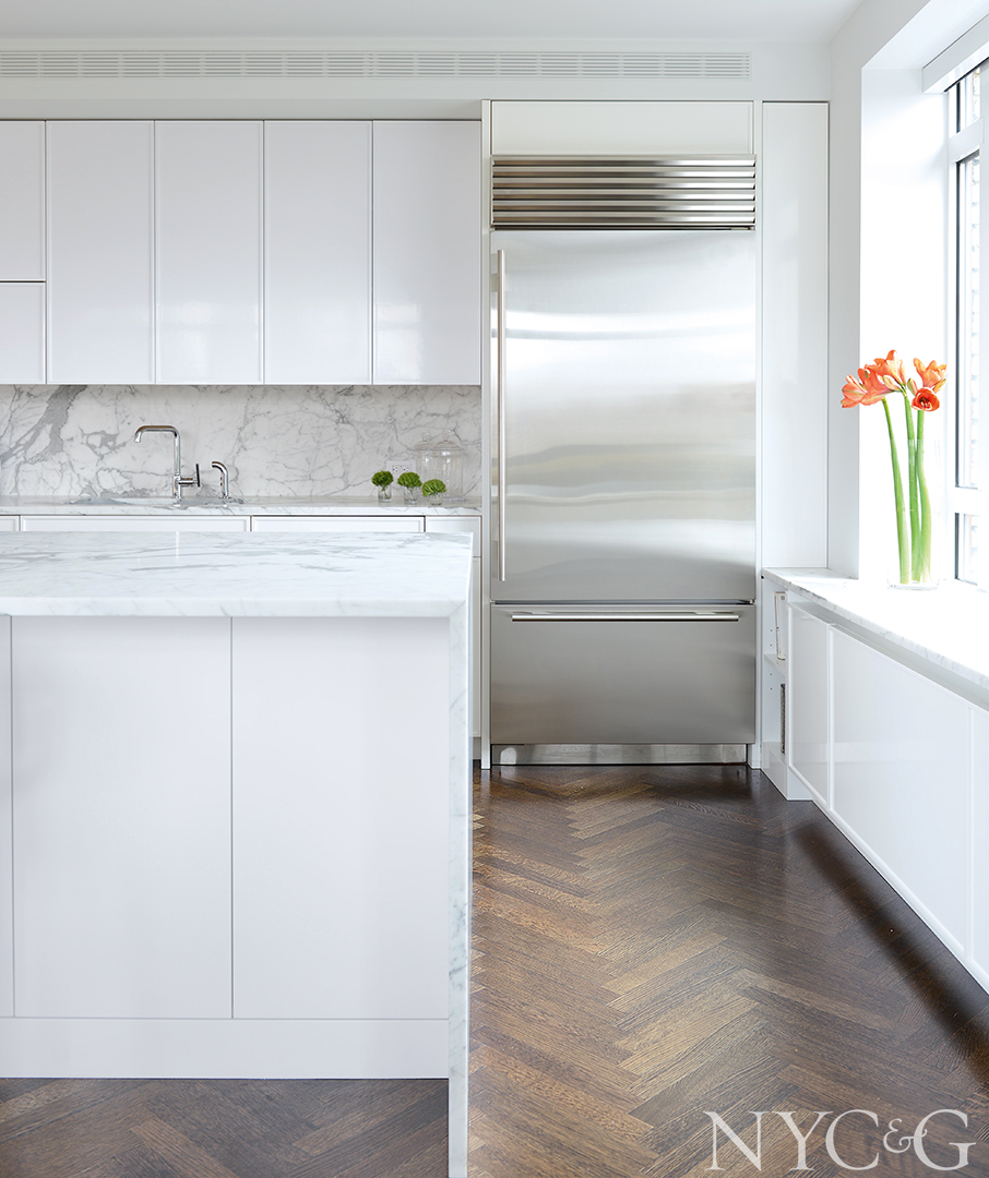 The owners of this Central Park West apartment wanted to give it a sense of modernity and simplicity, so Wettling Architects reimagined the kitchen, installing a striking veined marble and sleek cabinetry that are offset by more traditional wood herringbone floors. “White cabinets with little hardware and a beautiful marble,” says judge Judy Ross. “It’s all very chic.”