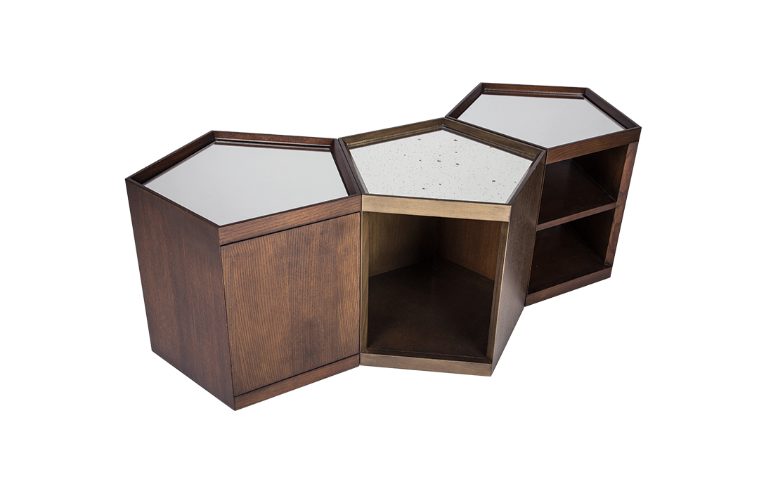 These mirror-topped cocktail tables can be used separately or grouped together and are available in three different storage configurations and several finishes.