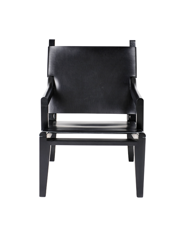 The Loix armchair and matching stool feature a chic mix of wood and leather.
