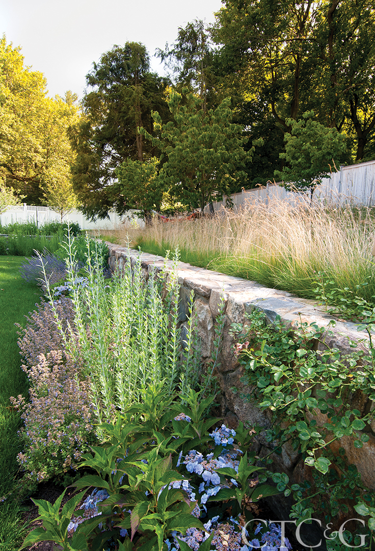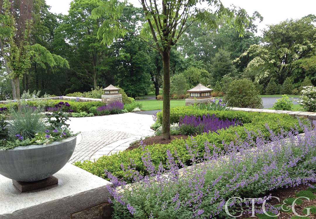 For this Greenwich home in Field Point Circle, the designers from Gregory Lombardi Design Incorporated were intent on marrying the landscape with the Arts & Crafts character of the house. In keeping with that aesthetic, the landscape is decidedly more formal and mannered close to the house, but becomes more natural the farther out one goes toward the property’s borders.