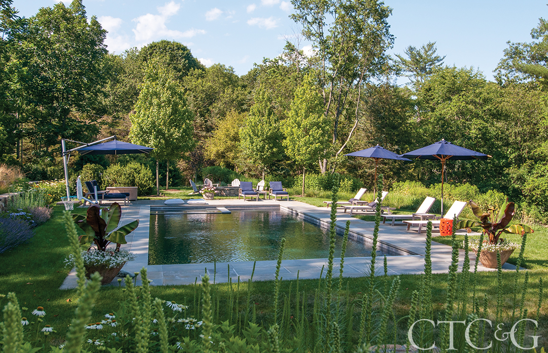 One of the magical, natural qualities of this part of New Canaan is its rolling hills. But the undulating terrain can make the siting of a new pool difficult. Such was the challenge for landscape architect Sean Jancski. In order to preserve the shapeliness of the two-acre property, Jancski placed the pool on one of the hills closest to the edge of the site. An elegant allée of trees at one end of the pool leads the eye into the distance and frames the fire pit in between the trees.