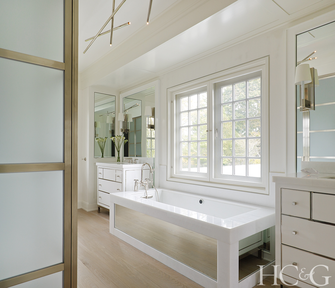 Designer Chris Desmone and Austin Patterson Disston Architects joined forces on this Southampton home’s master bath, accessed from either the bedroom or walk-in closets. Large windows illuminate a mirror-paneled tub, which is flanked by a pair of nickel-trimmed lacquer vanities; cerused-oak floors, a frosted-glass shower, and a ceiling fixture by Billy Cotton complete the look. Parker admires the “innovative use of materials.”