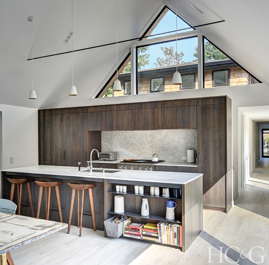 For an East Hampton residence, the architects designed a modern addition that includes a sleek kitchen kitted out in walnut, white oak, steel, and glass. Brown loves the layout and use of materials, while Langham’s favorite element is the “sculptural niche that houses the stove.” Parker describes the project as “really creative. I could live in this smart, well-edited space.”