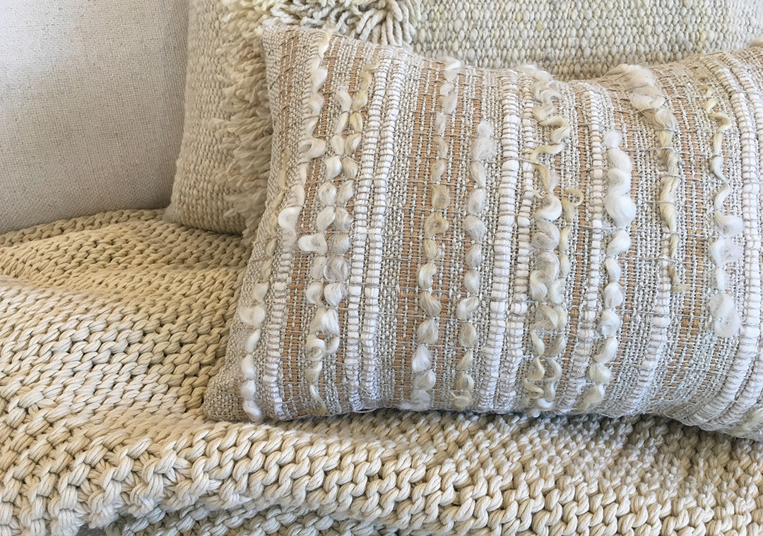Shed Textile Co.’s pillows, hand-woven in Southold from materials such as merino wool, canvas, and raffia, lend texture and personality to any space.