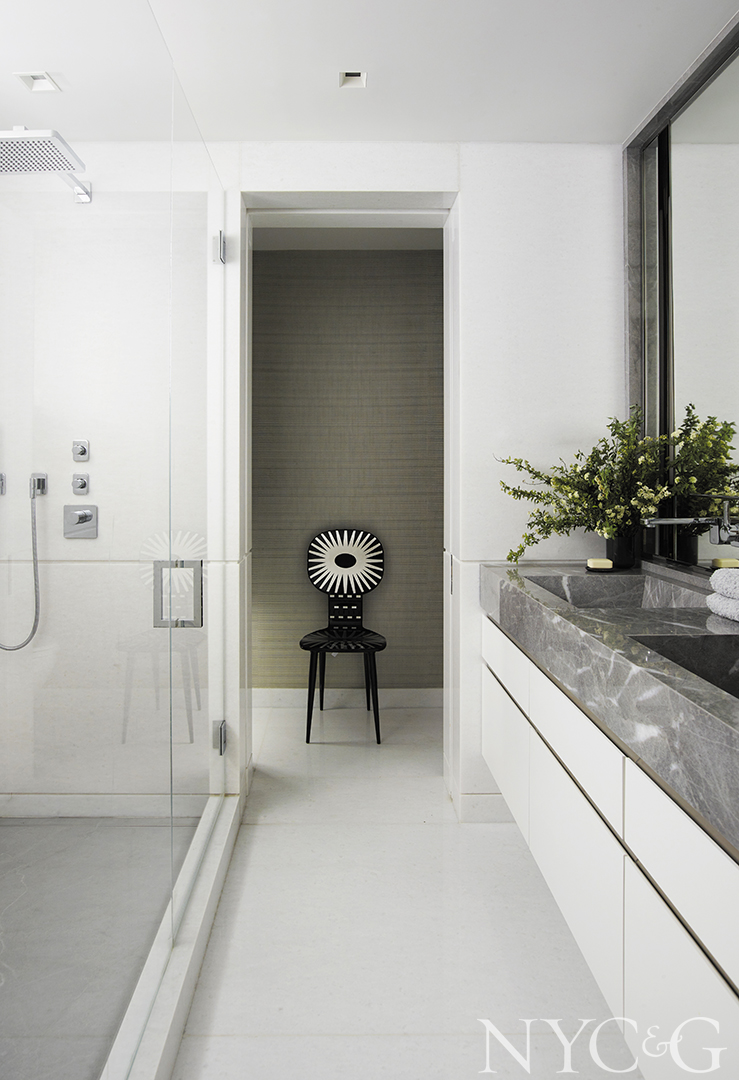 To add contrast to a highly decorative Upper East Side master bedroom, the firm designed a decidedly pared-down master bath, installing a floating Blue de Savoie marble vanity and cladding the walls and shower in Bianco Neve marble tiles. “Very simple, but chic,” remarks Taft-Gersten. “It’s seamless, meditative, and beautiful,” adds Weitzner.