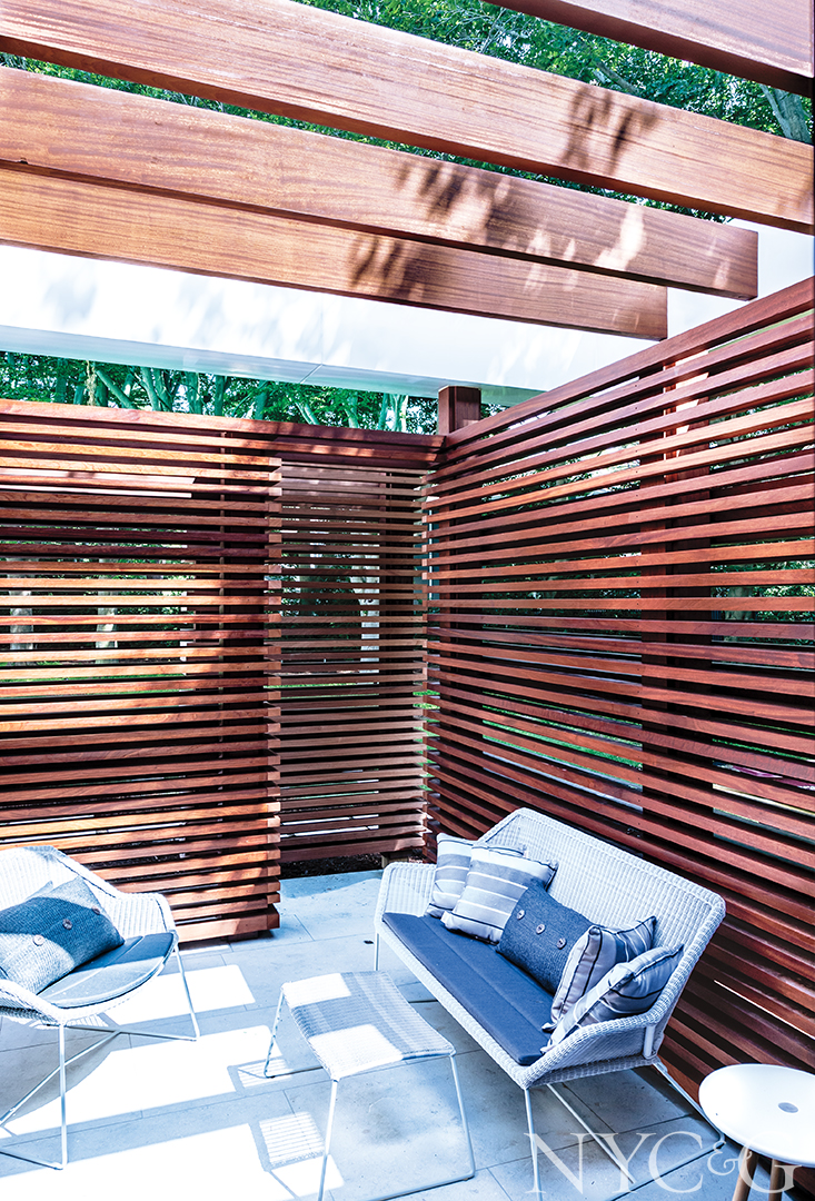 For an Old Westbury master bath, Mojo Stumer Associates created a spa-like, indoor-outdoor oasis by integrating slatted mahogany screens that both provide privacy and filter light from an adjacent terrace.