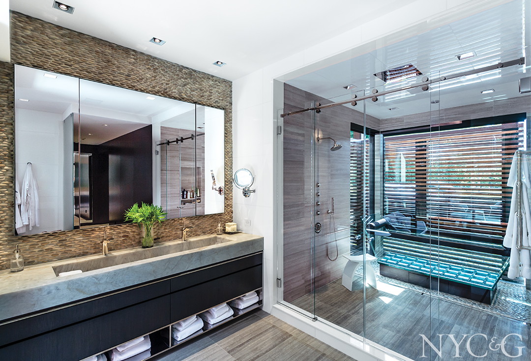 Fittingly enough, a freestanding glass tub—its filler is concealed in the ceiling—sits on a bed of river stones. “The relationship to nature gives the room a very peaceful vibe,” says judge Lori Weitzner. “It’s a great bathroom to ‘Zen out’ in,” concurs judge Analisse Taft-Gersten.