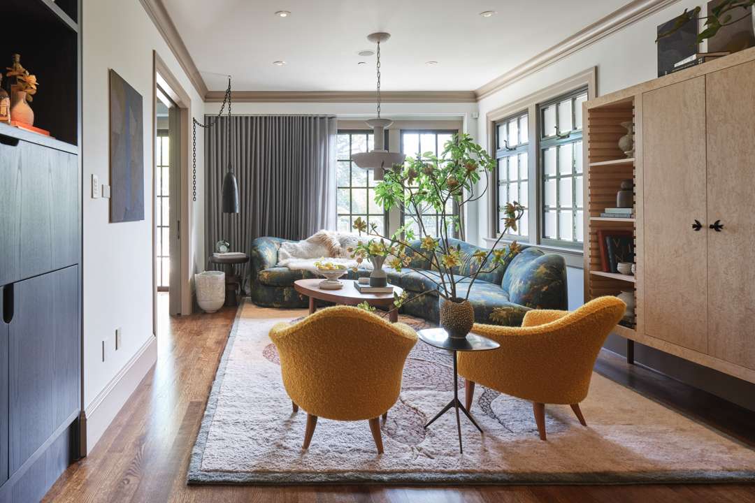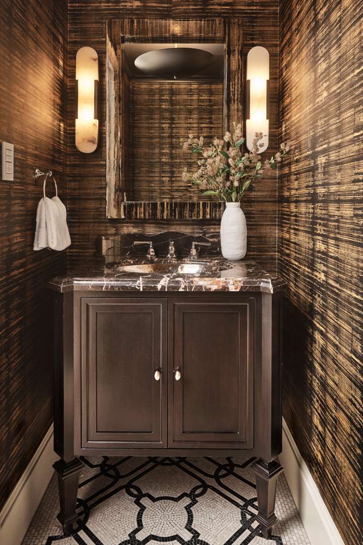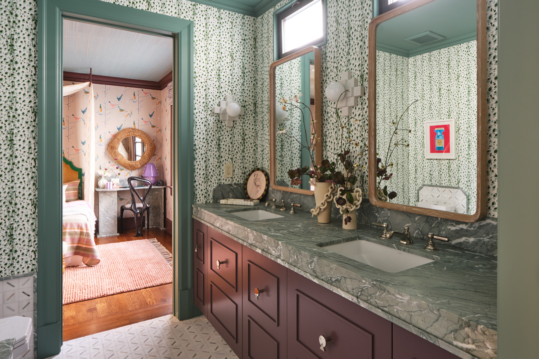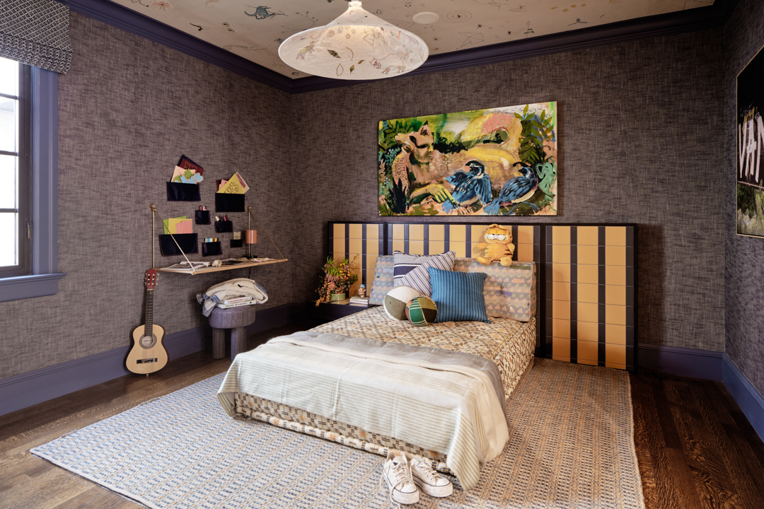 Kelly Hohla designed the gorgeous kitchen, complete with bespoke cabinetry and stunning stone counters and backsplash. She also designed the adjacent open family room, and it’s all topped with an elegant, floral patterned ceiling. Will ceiling wallpaper start trending next? Inspiration is everywhere inside designer showhouses.