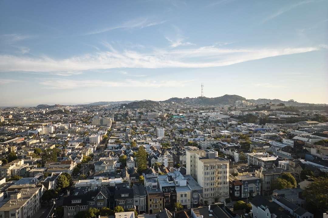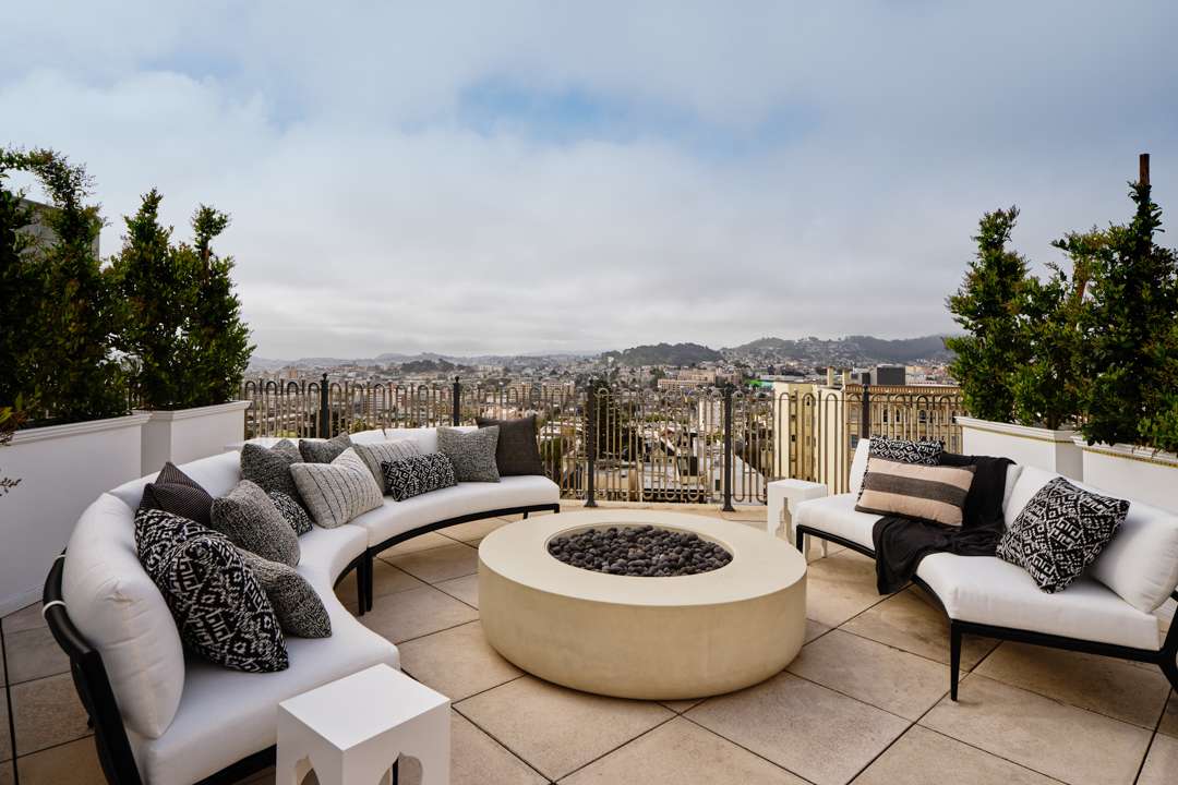 The 9,390-square-foot stunner totals five bedrooms. The modern yet artful primary suite boasts a gas fireplace, two walk-in closets, and an ensuite bath with its own balcony. Up on the roof, an 2,150-square-feet terrace looks out to the iconic San Francisco Bay. Dustin Moore of Strata Landscape Architecture oversaw the transformation of this urban outdoor sanctuary, which holds an outdoor shower, fire pit, and powder room—ideal for entertaining. There is a separate, private three-bedroom apartment on the garden level, which was designed by Katie Monkhouse.