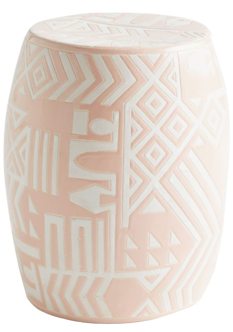 Fashion designer Whitney Pozgay has collaborated with Anthropologie on a new home collection. The tribal motif of the glazed earthenware stool was conceived by Pozgay following a trip to Africa. $168.