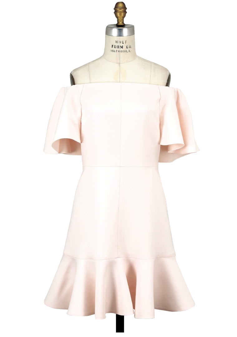 Understated elegance in blush, this off-the-shoulder ruffle dress designed by Valentino whispers sophistication. $2,450. Available at Mitchells.