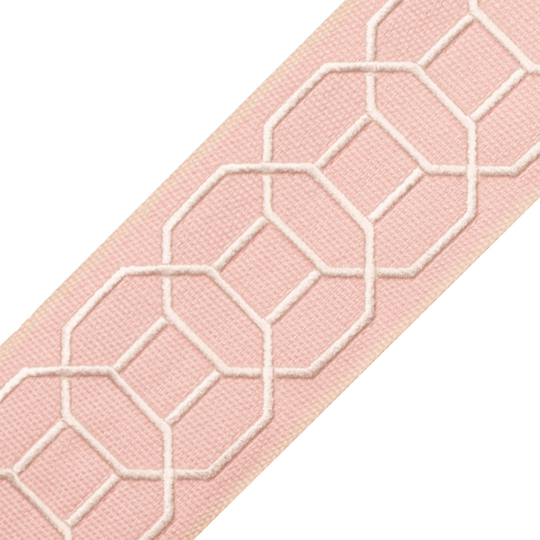 Inspired by Japanese obi sashes, the Sakiori border by Samuel & Sons features interlocking hexagons in satin stitch embroidery on a linen canvas ground. Price upon request (T).