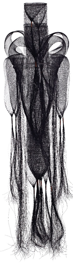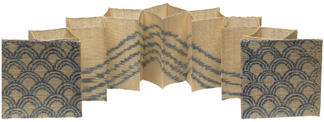 Case in point: Sekimachi broke important ground in the 1960s with her experiments using nylon monofilament, a new material with a dual character—pliable but able to hold shape. A virtuosic piece from this series, Katsura (1971)—meaning “hair piece”—is the show’s centerpiece. An intricate, accordion-fold work, it takes inspiration from a miniature book of woodcuts the artist treasured as a child. The book was one of Sekimachi’s few possessions during her confinement in a WW II Japanese-American internment camp. The woven-linen collection features a wavelike motif drawn from traditional indigo-dyed Japanese textiles that embodies what Sekimachi describes as “the Japanese aspect of duality between strength and fragility.”