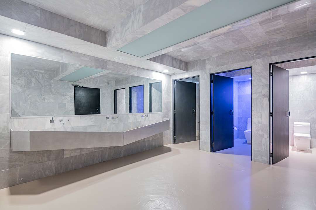The home is truly singular, boasting glass all around—don’t worry too much about privacy though, as it sits on nearly two acres of private land. It has a completely open-concept floor plan free of columns. Minimalism at its finest, the black and white color palette leaves a beautiful canvas for a potential buyer to add pops of color through furnishings or perhaps sculptures. The three-story home poses two staircases to reach the six bedrooms and seven bathrooms upstairs. Twp primary suites with custom walk-in closets and spa-like bathrooms are accessed via one staircase, while four guest rooms and ensuites are accessed by another.