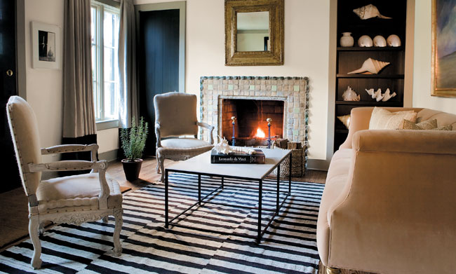 Natural Textures | Cheryl Tague’s seashell collection, original clay fireplace tiles and the Iranian tribal rug hail from various parts of the world, yet their simple lines and compatible colors forge a tranquil setting for the living room.