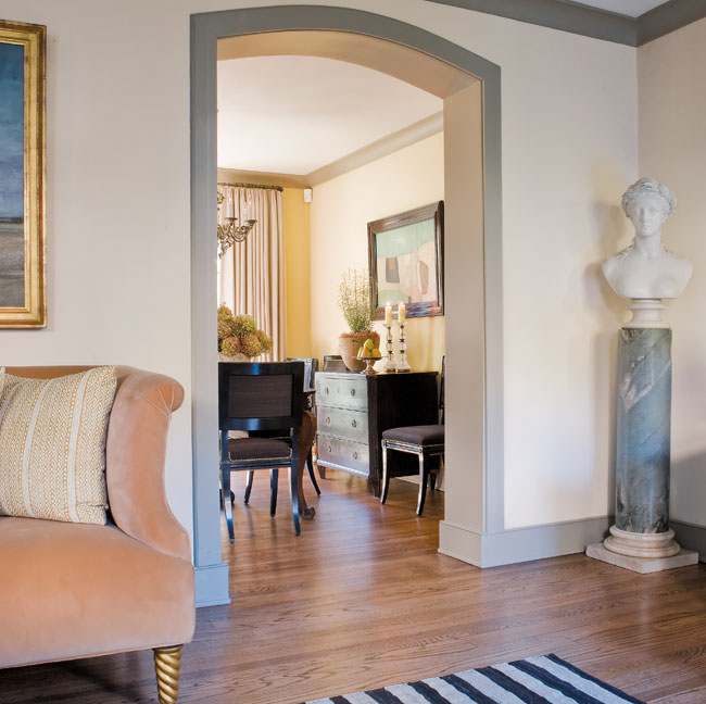 Opening with Grace | The polished oak floor creates a welcoming feel that flows uninterrupted from room to room. Lit by the 1940s Italian chandelier, the dining table comes from a Paris flea market.