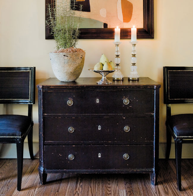 Simplicity Reigns | British artist Tim Woolcock’s Coastal Path hangs above a late 18th-century chest topped by rock crystal candlesticks made from lamps found on London’s King’s Road.
