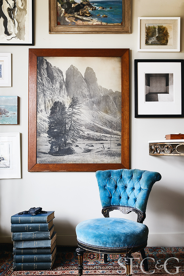 A blue slipper chair given to Jacobus by a client complements a black and white framed photograph of Yosemite.