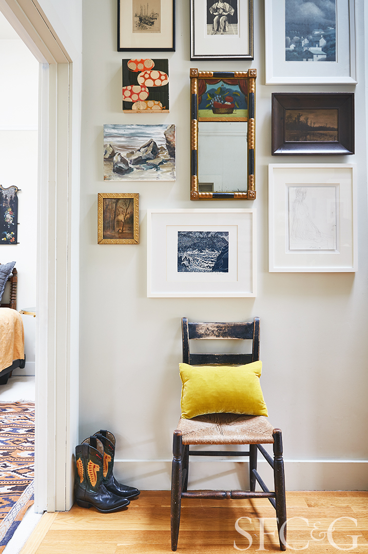 Jacobus’ collection includes works in a range of mediums; here, a grouping of drawings, paintings and prints highlights the hall.