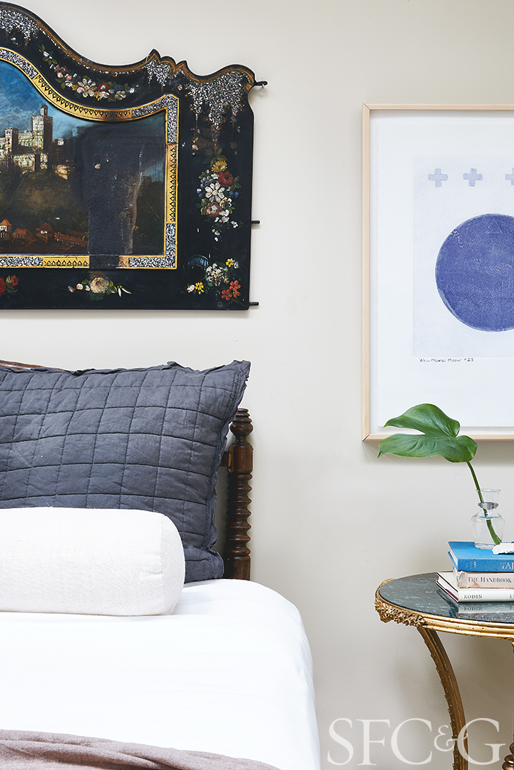 The master bedroom features a decorative headboard whimsically hung on the wall above the bed.