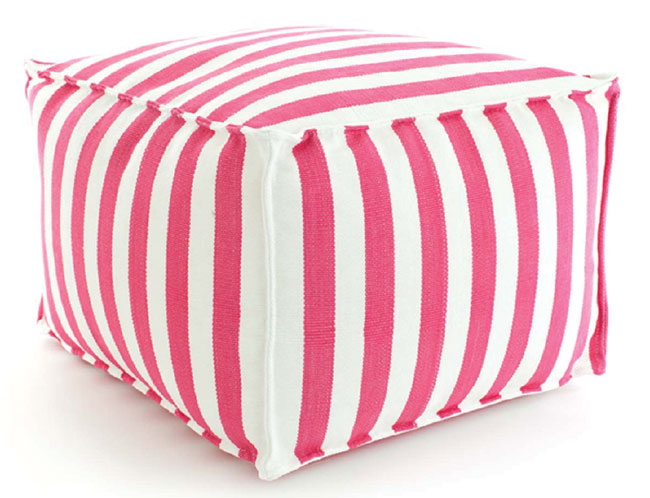 Pine Cone Hill’s classic nautical stripe pouf, made of durable polypropylene and filled with polystyrene beads, is the perfect seating for a festive outdoor area, shown here in Fresh American Trimaran fuchsia and white stripes. Pine Cone Hill, through Lillian August, Norwalk, 203-847-3314, lillianaugust.com, pineconehill.com.