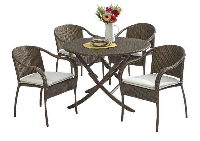 The Sevilla five-piece set, made of woven outdoor wicker, includes four stackable chairs and a 42-inch folding table. Fortunoff Backyard Store, Stamford, 203-817-0760, fortunoffbys.com.