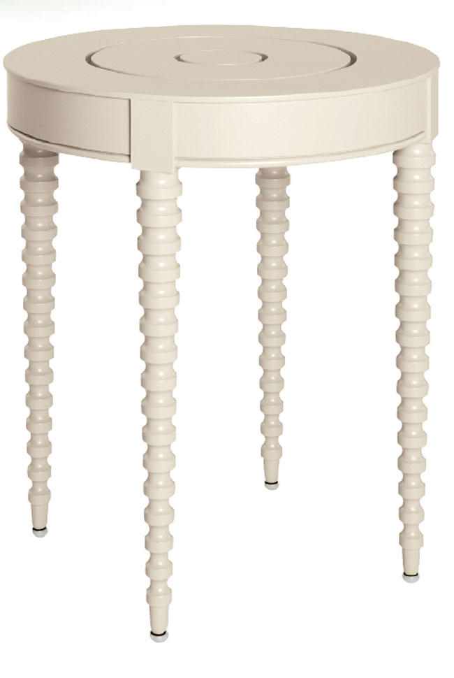 Intended for outdoor use year round, the Lark drinks table with Round Adams Big Top showcases an eclectic style, while its turned legs reference late 17th-century bobbin furniture. McKinnon & Harris (T), NYC, 212-371-8260, mckinnonharris.com.